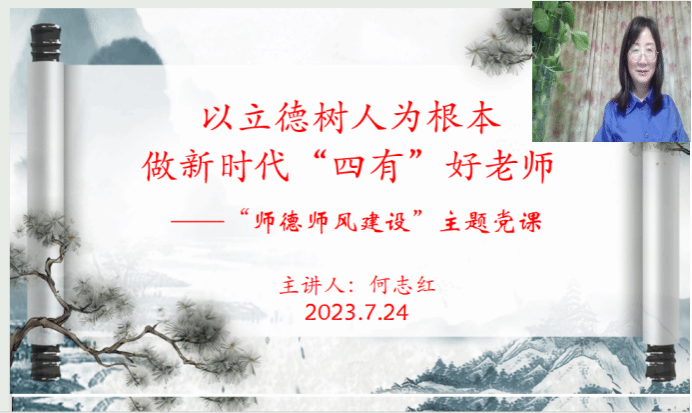 为进一步落实学习贯彻习近平新时代中国特色社会主义思想主题教育“以学铸魂,以学增智、以学正风,以学促干”总要求,推进公司师德师风建设工作,7月24日晚,公司党总支在线上举办了题为《以立德树人为根本 做新时代“四有”好老师》专题党课,党课由党总支书记何志红主讲,全体教职工党员参加了会议。