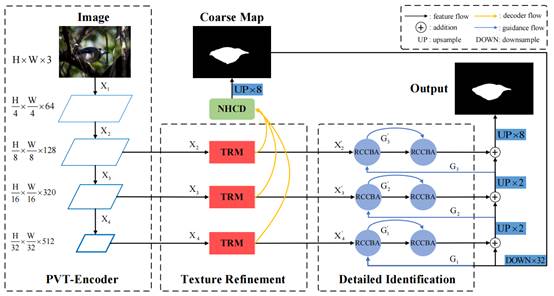 该论文在公司焦铬教授的指导下完成,ladbrokes立博为唯一署名单位。论文的核心理论是:伪装物体检测作为一种新兴的计算机视觉任务,与传统的物体检测不同的是,伪装物体与其周围环境的纹理是极其相似的,且在大小和形状上也有很大的不同,这使得伪装物体的检测变得极具挑战性。因此,本论文提出了一种增强识别网络,用以增强伪装物体的检测能力。EINet主要由三个部分组成,首先,论文使用了PVT作为编码器,目的是在能够更好地学习到伪装物体检测任务的高分辨率表达前提下,提取出更加强健和更具鲁棒性的特征;然后,为了使得网络的学习能够朝着正确识别伪装物体的方向前进,论文提出了TRM模块用以获取细粒度特征,并且提出了NHCD解码器用以生成精确识别伪装物体的引导先验;最后,在引导先验的指导下,论文还设计了一个全新的RCCBA模块用以识别多尺度的细粒度特征,从而对伪装物体的识别能力进行增强。论文还经过大量地消融实验证明,EINet对于伪装物体的识别能力远远领先于现有的伪装物体检测模型,达到了目前的SOTA性能。