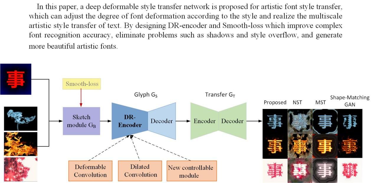 该论文是在公司林睦纲副教授的指导下完成,ladbrokes立博为唯一署名单位。论文核心理论是:字体样式转移的本质是在保持字体字形结构的同时,将图像的样式特征转移到字体中。目前,基于卷积神经网络的生成对抗网络在字体样式生成中发挥着重要作用。然而,传统的卷积神经网络识别字体图像存在对未知图像变化适应性差、泛化能力弱、纹理特征提取能力差等问题。当字形结构非常复杂时,复杂字体图像无法有效识别。本文提出了一种用于艺术字体风格转移的深度可变形风格迁移网络,该网络可以根据风格调整字体的变形程度,实现文本的多尺度艺术风格转移。该模型包括用于学习字形映射的草图模块、用于学习风格特征的字形模块和用于融合风格纹理的迁移模块。在字形模块中,设计了Deform-Resblock编码器来提取字形特征,其中引入了可变形卷积,改变残差模块的大小,实现了不同尺度特征信息的融合,更好地保留了字体结构,增强了文本变形的可控性。因此,我们的网络对文字的控制能力更强,对图像特征信息的处理能力更强,能够产生更加精美的艺术字体。