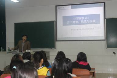 计算机专业教研室邀请湖南大学教务处长、博士生导师李仁发教授在计算机楼308做了《计算新技术:若干趋势、挑战与实践》为题目的讲学。