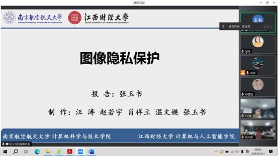 2024年12月1日晚8:00,南京航空航天大学张玉书教授应邀为ladbrokes立博师生开展了一场题为“图像隐私保护”的学术报告。报告会在腾讯会议上召开,由李浪经理主持,ladbrokes立博部分老师及研究生聆听了本次报告。